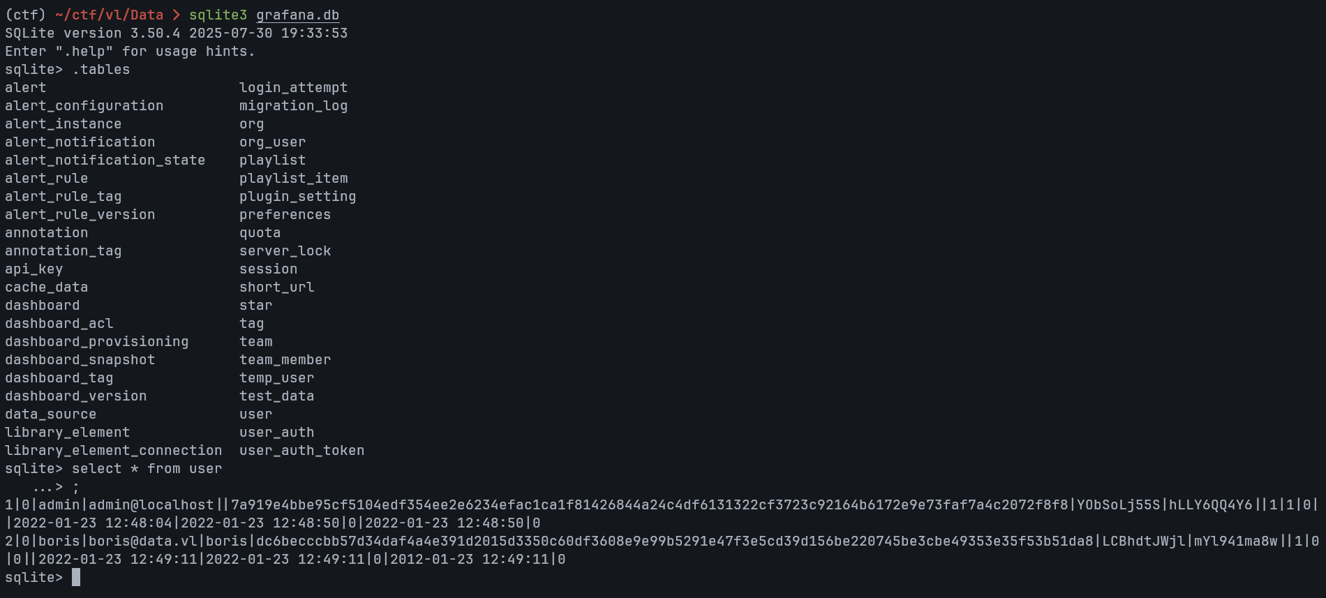 Data is an Easy Linux machine that involves exploiting CVE-2021-43798 , an arbitrary file read via path traversal in Grafana . By exploiting this vulnerability, the database file for Grafana is extracted, and the hashes in the database are converted to a format readable by Hashcat . The hash is then cracked and can be used for SSH access to the target as user boris . The compromised user has the privileges to execute docker exec as root on the system, allowing the user to escalate and obtain root access by adding the privileged flag to running containers and mounting the host filesystem.