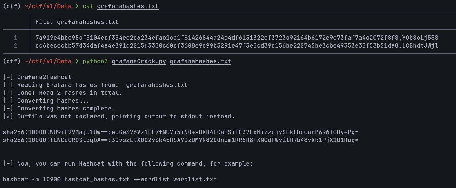 To prepare the hashes for cracking, I used the tool grafana2hashcat.