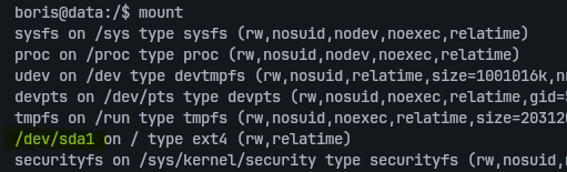 boris@data:/$ sudo docker exec --privileged --user root e6ff5b1cbc85 mount /dev/sda1 /mnt/pe