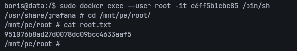 boris@data:/$ sudo docker exec --user root -it e6ff5b1cbc85 /bin/sh