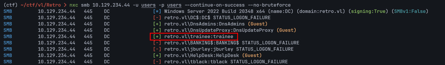 This confirmed a Windows DC (domain retro.vl). We added its IP to /etc/hosts as retro.vl for convenience.