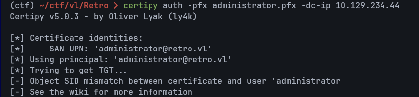 [*] Got certificate with UPN 'administrator@retro.vl'
