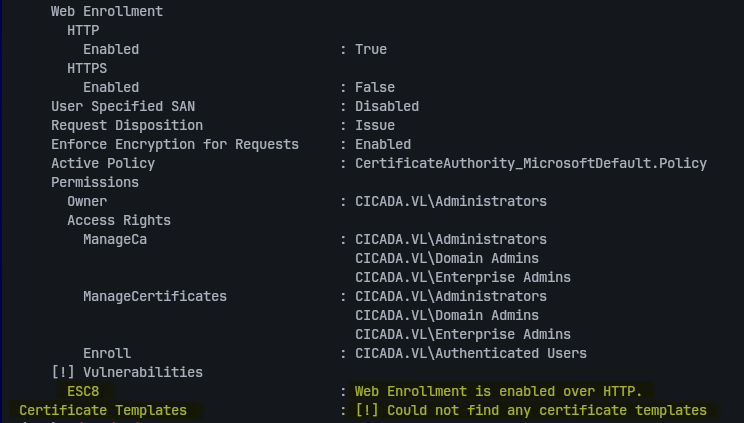- Vulnerable to ESC8 (NTLM/Kerberos relay to ADCS HTTP endpoints)